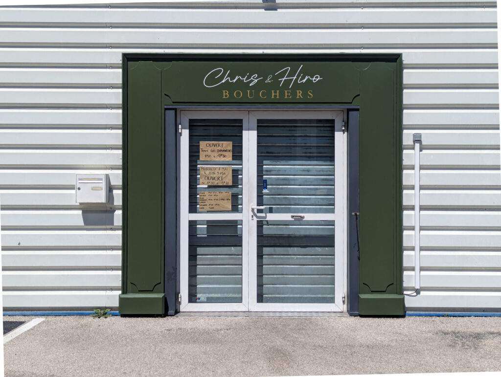 Chris et Hiro sont deux jeunes bouchers passionnés. Ils ont fait appel à moi pour peindre la devanture de leur nouveau commerce au Beausset, dans le Var. Un beau texte calligraphié peint en blanc et une peinture dorée pour le mot « Bouchers ». Le résultat est artisanal et authentique, tout comme leur travail !